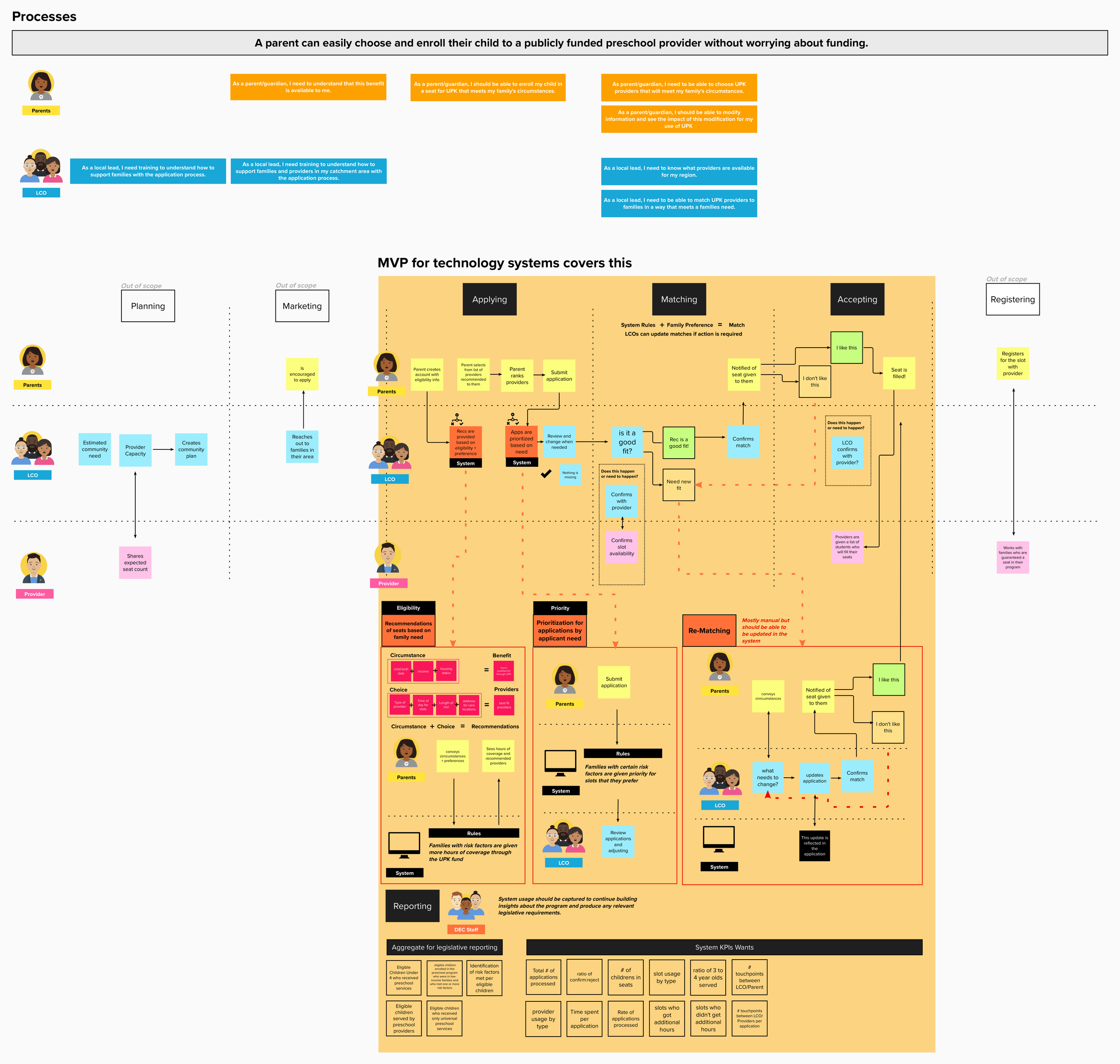 Once we began to identity the people, processes, and data required I lead the initial service design architecture for the program. We utilized these artifacts to inform the authoring of the procurement of the technical partner selection for universal preschool. We lead a human-centered procurement process, bringing in both educators, family childcare providers, and parents/guardians themselves to help select the ultimate solution.